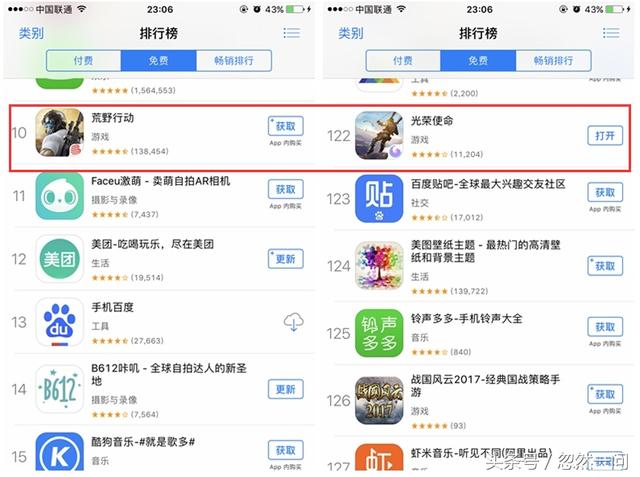 据苹果最新的App Store排行显示,同为“吃鸡”类游戏,《荒野行动》排第10,《光荣使命》在122位,甚至还不如《穿越火线》的“吃鸡”资料片枪战王者。