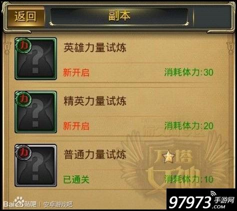 2.属性试炼(例如力量试炼):普通属性试炼每次消耗10点体力,精英属性试炼每次消耗20点体力,英雄属性试炼每次消耗30点体力。
