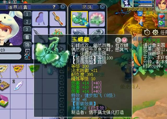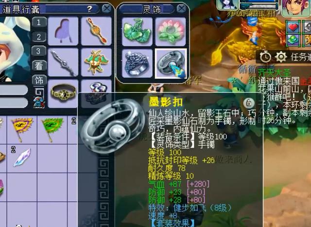 后排灵饰装备看起来很普通,但附加了属性很完美,两件都是100级装备,附加的都是双防御与一气血属性,点化了8级健步如飞特效,打满了10级星辉石宝石。