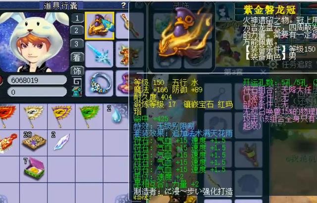 除了项链装备之外,其余5件装备都是无级别装备,头盔是150级装备,附加无级别特效,点化了满天花雨套装效果,锻炼了17级红玛瑙宝石。