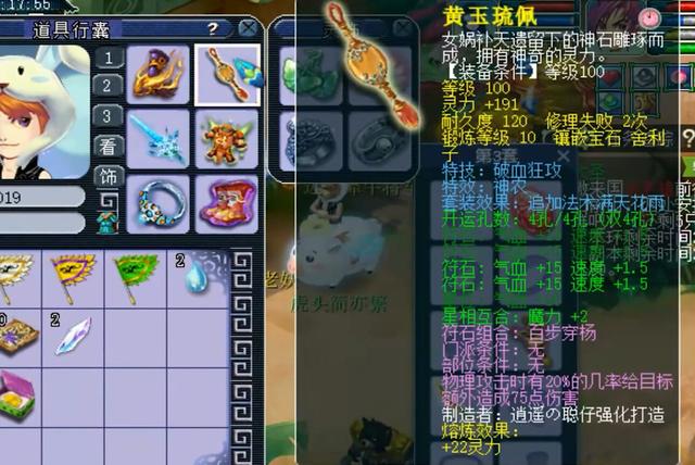 项链装备虽然没有附加无级别特效,但附加了逆天双蓝字,特技破血狂攻,特效神农,点化了套装效果满天花雨,开满双4孔,熔炼灵力22,总灵力213。