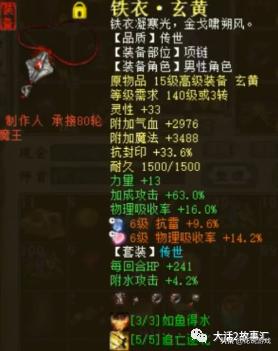 项链是15级的铁衣传世套装。炼化极品属性:力量加13,加成攻击63,物理吸收率16。