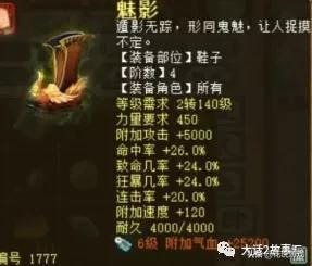 现在版本高端大力的必备物资。4阶仙器鞋子。大力属性一应俱全。附加攻击5000,命中率加26,致命几率24,狂暴几率24,连击率20,附加速度120,一颗6级宝石附加气血25200。一般打造大力的思路都是先买仙器鞋子,再根据缺少的属性去配其他部位。