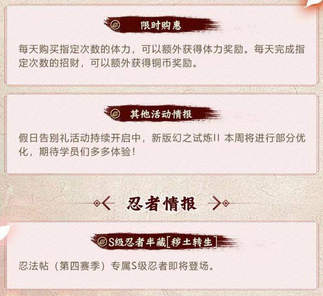 最后就是幻之试炼的一些改动,其中加入了之前帕克预告的少年时期宇智波斑,并且也新增了木叶丸和日向花火通关幻之试炼可以拿到幻神称号的设定。因为在这次的幻之试炼上线以后,一直有玩家认为少年奇拉比要比之前的自闭花火和木叶丸更难,这次的更新设定也算是满足了一些玩家的需求。其他的就是一些BUG修复和尾兽秘境的优化,本周没有任何忍者返场。