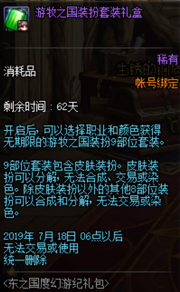 游牧之国装扮礼盒,账号绑定。打开可以获得8个部位的时装和皮肤装扮,获得的时装适用高级装扮属性看,可以进行合成天空和分解。