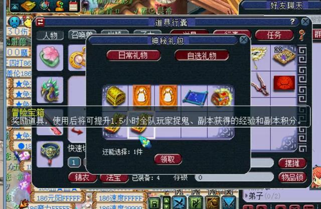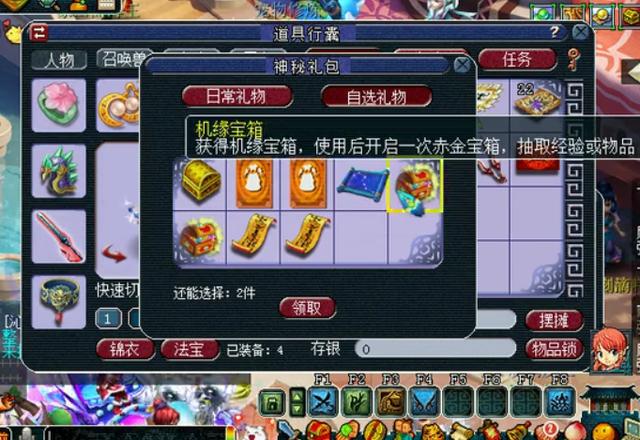 还有一个神秘礼包,礼包里面包含好几种奖励,比如修炼宝箱、锦衣折扣券、机缘宝箱等。玩家只能选择其中的两件道具。