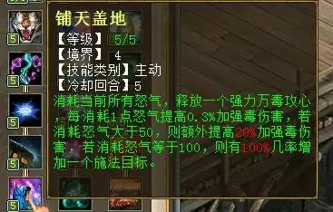 消耗当前所有怒气,释放一个强力万毒攻心,每消耗1点怒气提高0.3%加强毒伤害,若消耗怒气大于50,则额外提高20%加强毒伤害,若消耗怒气等于100,则有100%几率增加一个施法目标。(冷却五回合)