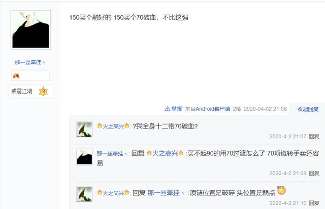 有网友看到该玩家花费300万金币买了一件没熔炼满的武器觉得并不是很值,还不如花费150万金币买把熔炼满的武器,再花费150万买一条70级的破血狂攻特技项链,同样能达到现在的效果,而且还不用再花钱熔炼了。但是这位玩家却并不这么认为,目前角色全身都已经是12段的宝石,如果穿戴70级的装备明显会大幅降低防御力,而且角色目前的项链拥有破碎无双特技,实在不值得更换。