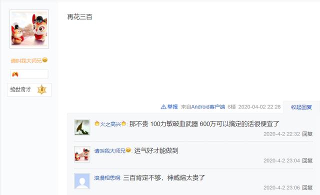 网友看到这位玩家心意已决于是便估算了一下熔炼的费用,如果运气好差不多花费将近300万左右的金币就能熔炼满值,算上武器的价格,相当于花费600万金币买一把力敏双加并且带有破血狂攻特技的武器,这样算下来还是比较划算的。