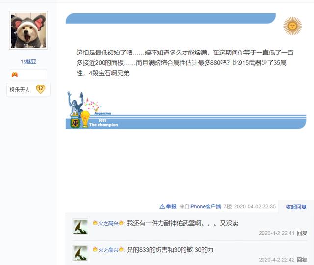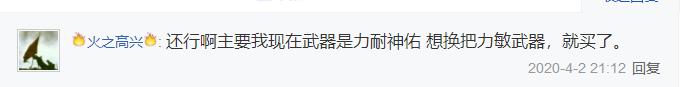 也有网友称这次交易不太理智,这把武器虽然拥有力敏双加属性,但是基础属性实在是不如人意,仅有671的物理伤害加成,在100级的武器属性范围中几乎属于最低值,想要熔炼满值不是一件容易的事。该玩家看到后称自己之前的武器并没有卖,还可以继续在战斗中使用,等把武器熔炼满值再进行更换。