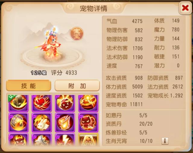 这只10技能龙女,4725体资、2547法资,1.21的成长,整体属性十分优秀。并且,技能数还多达10个,称得上精锐的毕业级法宠了~