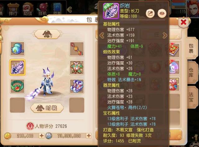 首先晒出的是角色的武器,这把武器的属性非常不错,基础法术伤害属性159点,再加上熔炼的26点,能够提供185点法术伤害属性,已经接近100级装备的属性上限。同时这把武器还有着49点魔力属性点提升,再搭配上火舞苍穹器灵两件套23点法术伤害,共可以为角色提供257点法术伤害属性面板,对人物的伤害增幅巨大!值得一提的是,这把武器还拥有法术暴击特效加持,进一步提升角色的战斗表现,配合上两颗13级宝石,可以说除了没有特技加持外,已经属于神威组法系毕业武器。
