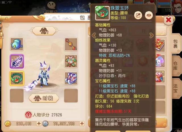 而在头盔、鞋子与腰带方面,所搭配的也都是100级装备,虽然没有特技加持,但是在属性方面都表现不俗,并且还拥有法术暴击+2%与忽视法防+2%的特效,增强角色的输出能力!唯一遗憾的是所镶嵌的宝石仅有11级,以后还需要提升一番。