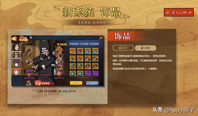 在《火影忍者》手游里隔了很久才上架的饰品系统,在《火影忍者OL》手游里没多久就出现了,主要原因这款游戏毕竟有页游的基础,一些内容添加上面也会更方便一些。