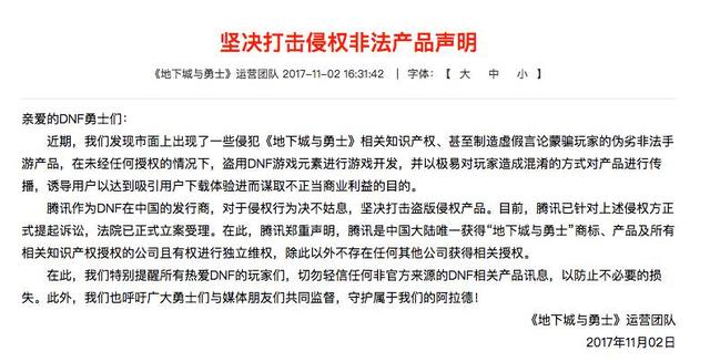 11月2日,腾讯《DNF》运营团队发布一则公告,称有产品盗用《DNF》元素进行游戏开发,将坚决打击。《阿拉德之怒》手游的财产交易或将继续走高,蹭IP需谨慎。