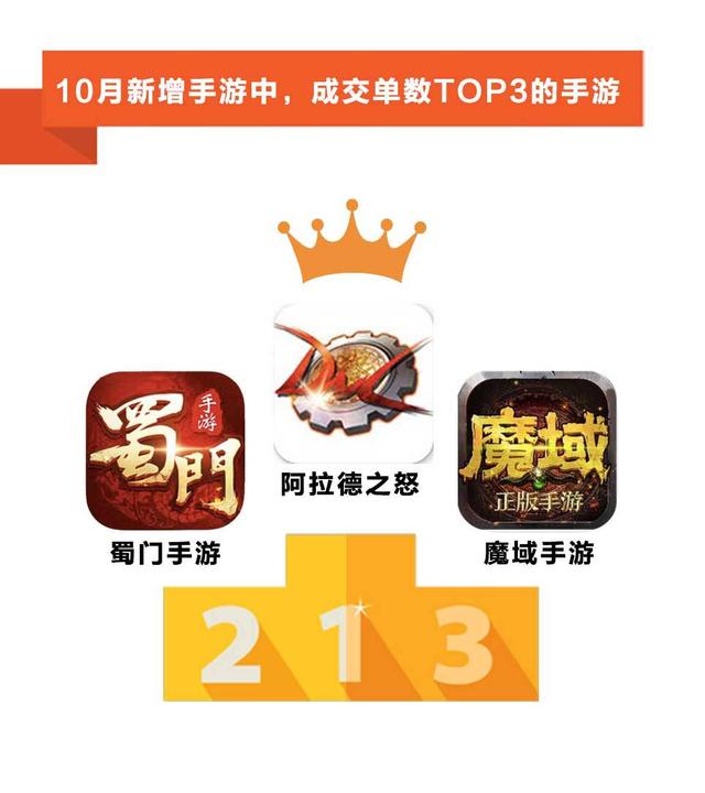 10月新增手游中,成交单数前三的手游分别为《阿拉德之怒》《蜀门手游》《魔域手游》,均根据经典IP改编。