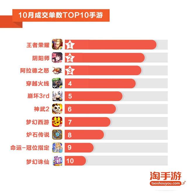 10月手游交易量排行榜,前三甲分别为《王者荣耀》《阴阳师》《阿拉德之怒》。TOP10中仅一款新游,其余均为老产品。