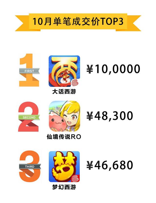 10月单笔成交价最高的手游为《大话西游》,售价10万元创历史新高。《大话西游》和10月单笔成交价第三名的《梦幻西游》,均于2015年上线,网易游戏研发,为回合制RPG品类,继承了原同名端游的核心玩法与数值系统。