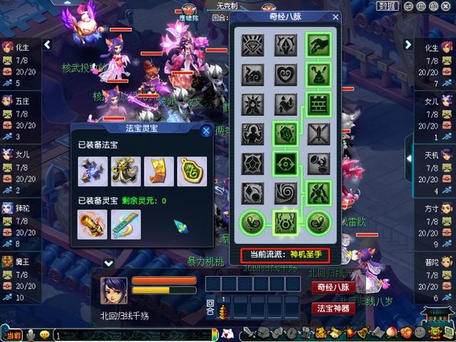 在上一次阵容试验失败后,北回归线痛定思痛,认真分析了自己阵容的不足,并在随后的比赛中将力天机城流派从“千机修罗”转为“神机圣手”,试图通过增加回复能力的方式补强阵容。或许是命运的使然,又或许是敢于争先的精神,这套新阵容的首战对手依然是以“女儿、五庄”为核心组成的“212”面伤阵容。