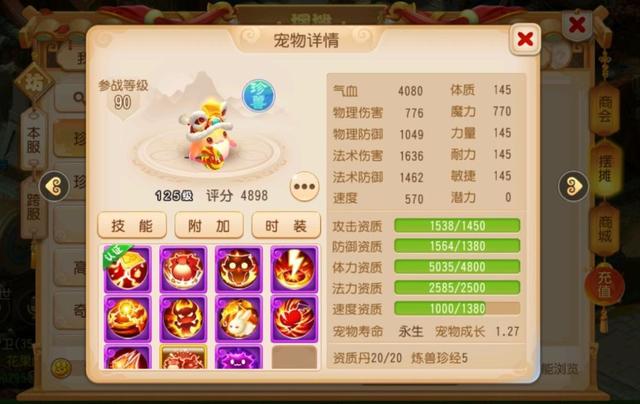 接下来是两只神威组的法宠吉里吉里,由于吉里吉里自身的特殊技能可以让自身受到物理攻击时有几率不受伤害,同时由于吉里吉里只能与变异宠物合宠,使得合宠得到的吉里吉里往往有非常高的资质和成长,因此是神威组服战大佬常用的法宠。第一只吉里吉里是8技能群法宠,宠物成长1.286非常接近满成长,可以说非常厉害了。同时法力资质2618远超宠物的最高资质,在高法连、高会心、高魔心和高法爆四个技能的加持下,这只宠物的输出能力可以说是非常恐怖的。