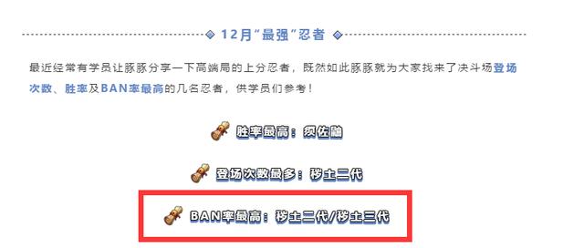 火影忍者手游段位赛中,双方段位达到上忍三后就可以选择两个禁用忍者,而当双方都达到暗部三的时候就可以选择三个禁用忍者,这样的机制在很多游戏中也都存在,主要就是为了避免看到一些强度过高的忍者出现。现如今的段位赛中金鸣应该是常见处于ban位前三,根据官方的数据显示,另外两个忍者应该是秽土二代和秽土三代。如果放到秽土水门未削弱之前,可能前三里面会有这个忍者,但现在的秽土水门没之前那么闪了,所以,被禁用的概率也降低了很多。