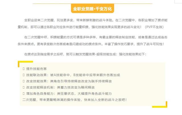 爆料二 全职业二次觉醒早在第一次觉醒的时候出现了一些很不平衡的情况,强势的职业太强,弱势的职业太弱,当时和策划沟通发现是出现了一些问题,本意是将觉醒仅在PVE生效PVP不生效,希望这次程序员小哥哥们给力点。根据体服的体验来看,二次觉醒的目的是为了提升现版本的总体伤害,只不过以各种方式来呈现而已,值得说的一点是,二次觉醒的触发条件是需要攒满能量条,才能释放二次觉醒技能,这就让积攒能量快的职业优势体现出来了,这里就不说哪个职业强哪个职业弱了。总而言之这让现阶段开荒难的情况得到了很大的改善。