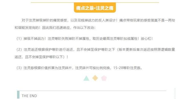 爆料三 注灵新机制注灵是上个版本出来的新机制,让人又爱又恨,这次更新对注灵机制进行了一次优化。第一条可以说很友好了,注灵失败不再掉属性和战力,连续失败的朋友也不用担心自己输出下降了。第二条增加了注灵保护机制,注灵返还也不会从零开始了,降低了高注灵的门槛。第三条增加了注灵碎片机制,玩家们可以通过碎片直接兑换高等级的注灵券(虽然感觉是土豪玩的)。不知道那个注灵19到10的哥们过的还好吗?