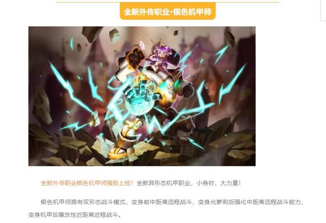 爆料一 新职业,银色机甲师玩家可通过完成游戏内外传任务之后,从学者选择分支银色机甲师。我在体服玩过一段时间机甲萝莉。从PVE来说,拥有着不俗的技能伤害面板和各种无敌技能,可能会成为龙本里的新输出巨头,大佬们已经准备好几千龙器门票和很多铭文箱子来砸新职业了吧!作为一个PVP玩家,我更关心的是机甲师在天梯中的表现,伤害爆炸!银色机甲师有2个形态,变身光萝莉的时候有着高伤害的中远程打击,而变身机甲后的近战能力简直恐怖,高盔甲破霸体技能,多无敌的技能衔接,让对手防不胜防。根据以往出新职业的惯例,新职业都是“爸爸”,请各位其他职业忍气吞声。