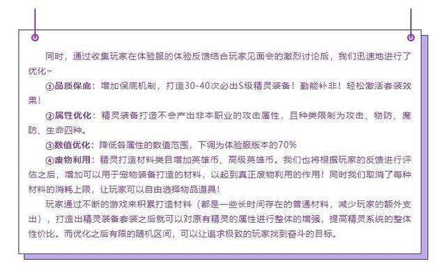 爆料五 废物利用·精灵三件套这个机制一是给玩家的背包减负,并且废物利用,让那些沉淀的材料再次被利用;二是对精灵的战斗力进行一次整体提升(这次的整体提升点很多,看来龙本又要难了)。虽然说降低了精灵装备的制作门槛,也增加了保底的奖励机制,但是玩家们最怕策划突然的关心~~~