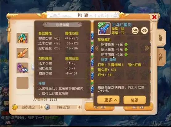竟然真的有简易武器!并且这把武器的属性还非常的爆炸的。法术伤害和治疗强度接近满值,如果有绿字属性的话就更好了,但是这么高的法术伤害和治疗强度在新区还是比较值钱的,法系门派和辅助门派都可以使用哦!