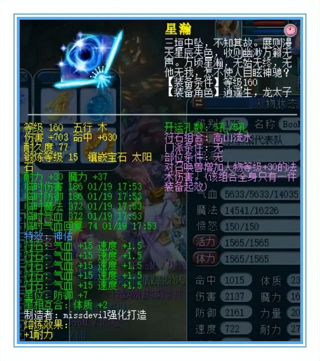 160级的武器需要多少级的建造技能?160级武器可能什么都有。打了15个太阳石,看起来五颜六色,总伤害703点还是不胜枚举。而且魔抗也很高,68分几乎是稳操胜券。特效的话,上帝可能会保佑很有天赋的人,在比武场上很踏实,可能会像兄弟一样。神在场上可能真的很讨厌,但也可能很牛逼,这样才能防止对方的扣球或者命中。这个武器只是为法律系统量身定做的。