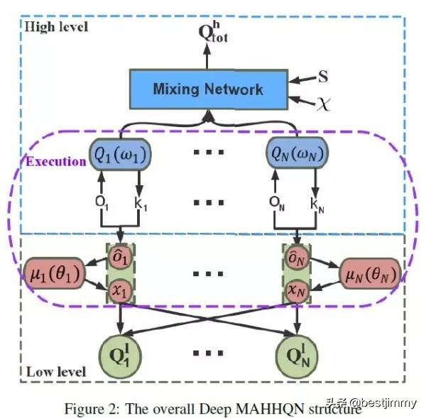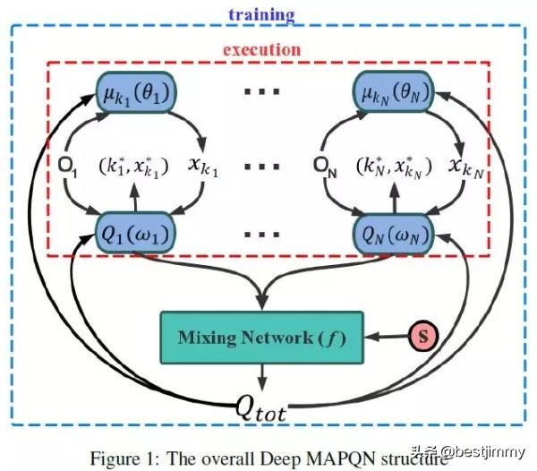 Deep MAPQN 是对 P-DQN [Xiong et al. 2018] 在多智能体环境下的自然扩展,利用 Qmix [Rashid et al., 2018] 架构实现多智能体的集中训练,分散执行架构。