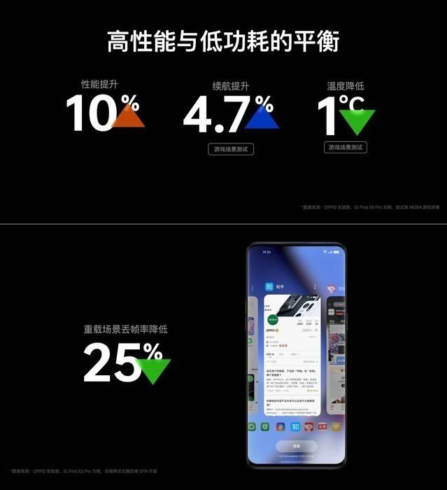 根据OPPO实验室数据显示,升级到ColorOS 13的Find X5 Pro,整机性能提升10%,在某热门MOBA游戏测试中,能够做到高帧率稳定,性能无损失,且续航提升4.7%,同时将游戏最高温度降低了1°C。并且在后台同开18个应用的前提下,同时做到重载场景下丢帧率降低至少25%。
