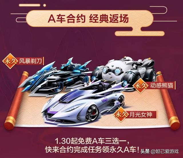 1月27日,QQ飞车手游官方发布:“在即将到来的1月30日,我们拿出了全新的A车返场活动供玩家进行挑选,月光女神/风暴剃刀/动感熊猫,玩家可在这三辆A车中任意选择一辆你没有的进行免费选择,除此之外,还有牛年T桖登录免费领/在线领点券等福利活动。”