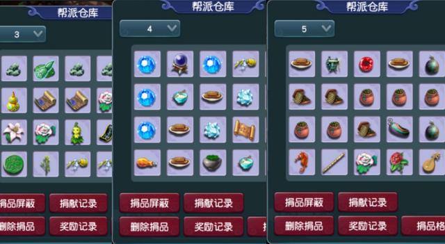 上面的这三个仓库就是某帮派的帮派仓库,这里面放着的这些东西全部都是该帮派的商人完成跑商任务时有可能获得的,所以在这样的帮派跑商真的很舒服,虽然不像其他的帮派丢的都是金刚石、高级魔兽要诀这类非常值钱的,但是上面这一个帮派里放的东西多呀,这样跑商任务每完成一票都会有惊喜奖励,不过现在能够支持跑商的帮派没有那么多了,现在能够正常运行的那些帮派中有很多的帮派资金都是属于紫色状态,紫色状态跑商给的帮贡奖励没有那么高了。
