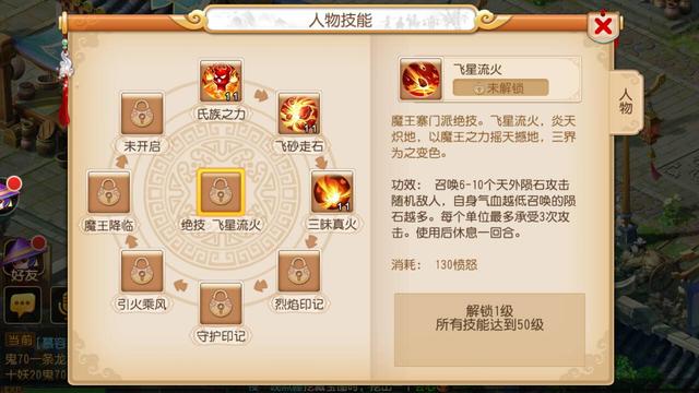 飞星流火:绝技,使用130愤怒召唤陨石,气血越低陨石越多。