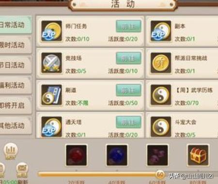 5、想要玩的好,对于贫民玩家来说,只能付出更多时间hé精力,每天把日常人物完成,还有限时人物,每天第一件事就是qiān到领福利,这可以领到稀有道具。问道手游里不只是等级提升le就可以,还有人物的道行和宝宝的武学,这两个也是很关键的,道行影响人物的障碍技能,能否封的住怪和对手全靠道行了,宝宝如果不想被对手封住,那就只有拼命提升武学了,人物道行和宝宝的武学有很多渠道可以得到,像帮派的任务,日常的除暴,限时的任务和不限时的降妖伏魔任务等等,这里要注意的是,降妖伏魔在晚上六点半到八点半是双倍奖励,所以不要错过,平时刷道要注意的是巡逻里有个双倍开关,打开可以得到双倍奖励,但点数也会消耗掉,每天的点数天机老人都会给200点,活跃度还可以领200点,这些点数是完全不够用的,所以平时刷道是jìdé关掉这开关,留给做任务用。