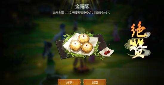 金露酥:使用烤架,依次放入鸡蛋、面粉、糖、油、燕窝,需要烹饪技能大于90,宴席食用效果是内功强度提高600点。