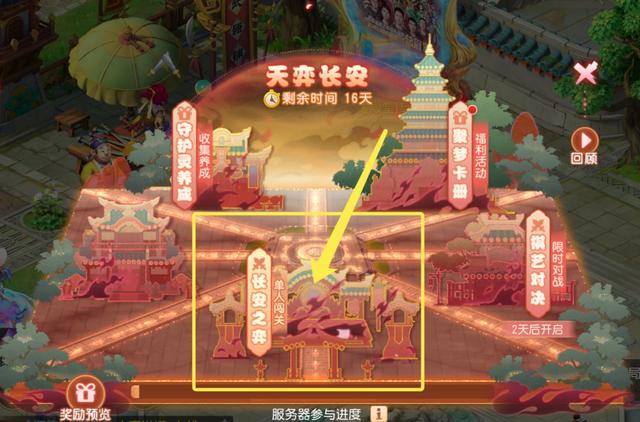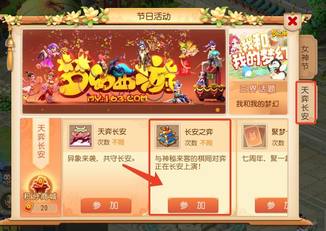 点击游戏界面左上角-天弈长安,点击长安之弈前往参与,或者点击节日活动,前往参加。