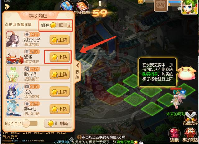 上阵棋子:进入闯关界面后通过在棋子商店中使用3点召唤能量购买棋子,购买后棋子将会直接上阵,召唤能量每轮获得10点,剩余的能量将会保留至下一轮次。