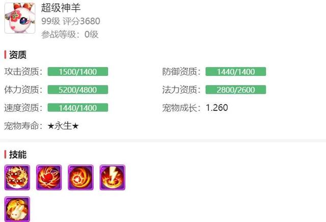 除了这两只宠物之外,角色上还有一只神兽超级神羊,成长已经被提升到了1.26,完全能够胜任日常任务,在战斗中出场非常有排面。