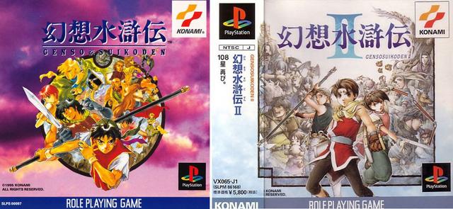 在初代PS主机上发售的两款《幻想水浒传》之游戏封面,左边为一代,右边为二代。