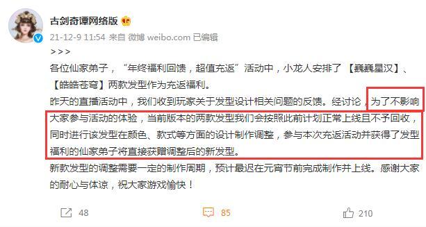 就以这次新版本的一件小事情为例,在此前版本预热时,官方放出来了最新的两款发型外观,但却被部分玩家嫌弃,觉得太丑,于是就在版本上线前一晚上,《古剑奇谭网络版》官方连夜做出决定,被嫌弃的发型会调整,然后调整后的新发型,白给玩家,这样的态度,估计也只有在古网这里能看见了吧。