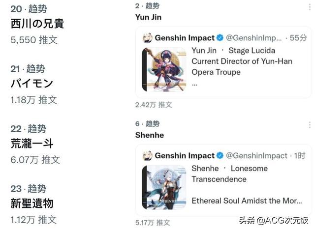 而从近期原神新动态在国外引发的事件,就能感觉到原神在国外的能量。比如早前原神官方放出荒泷一斗、五郎、申鹤和云堇这四位新角色的立绘时,就先后被推特用户送上推特热搜,成为海外原神玩家热议的话题。甚至连为这些原神新角色的配音的声优在内,也成为外服原神玩家热议的对象。