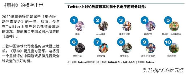 该报告指出接连的数年中国出海企业通过推特平台,和不少海外的用户建立十分深厚的联系。比如近两年在游戏行业的黑马选手米哈游,以原神这款游戏在推特掀起了热潮,原神也成为了2020年1月到2021年6月,推特上讨论热度最高的游戏,要知道原神是2020年9月才公测,在让掉2020年大半年时间的情况下,还能成为最高,可见原神在国外的热度。