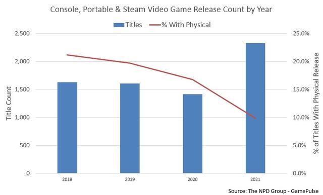 与此同时实体游戏的发售数量占比却是大幅下降,仅有约 10% 的游戏发售了实体版。