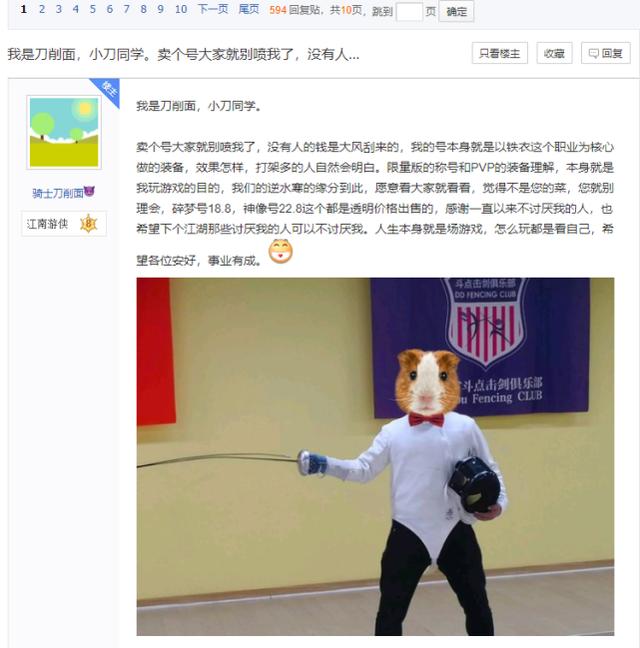 在取得了6V6冠军的成就后,刀削面一度觉得游戏中缺少了挑战,加上现实中公司事务日益繁忙起来,因此,在2019年,刀削面暂别了《逆水寒》,临走之时,他在《逆水寒》贴吧发出了道别贴,感谢了玩家们的支持与陪伴,并且与铁衣流派的爱好者探讨了很多对职业的理解和未来走向的判断,多达数千位玩家都对刀削面表示了不舍,可见,在玩家们的心目中,这个有财力、有实力又充满钻研精神以及对游戏热情的土豪大佬,才是自己心目中“游戏大神”的典范。
