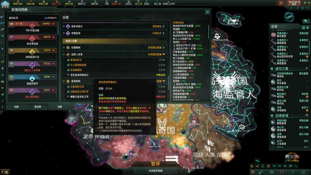 核心玩法:前期通过探索在黑暗森林原则下的宇宙星河中扩张你自己的星际王国,在此期间你若跟浪某一样有强迫癌的话,你绝对将很癫狂,因为你会不断的祈祷没有恶邻来打扰你构建完美的版图,事实却往往难以如愿。中期是非常有意思的,你会在科幻风种田(包括星球建设、星域规划、科技发展、天赋树规划等)与星海共同体的政治、军事博弈中乐此不彼。后期,在浪某看来,当星海共同体成了你一家独大的傀儡机构时就到了后期,这个时期稍微代入一下就很有西斯大帝的感觉,特别是成立泛星海联军的时候,真的让我联想到了星战的克隆人战争,彼时彼刻,“星海军政尽在孤手,孤欲王则王,尔等安敢置喙?”