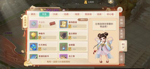 4.关于积分兑换,如果攒宝石的意愿不强烈,只兑换师徒积分的5个、地宫积分的5个和好心值的10个即可。如果是养育的中后期,郭氏积分的天运石可以考虑不换,只兑换雁塔积分的天运石即可。如果神兽不多,召唤兽佩饰打造材料全靠节日活动和召唤兽比斗白嫖即可。还有很关键的一点,老区的积分不要轻易兑换材料,建议等一波大更新,可能一些材料就很畅销了。