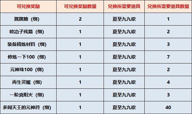 活动内容:上交30个道具【夏至凉面(绑)】可兑换30道具【夏至九九歌(绑)】